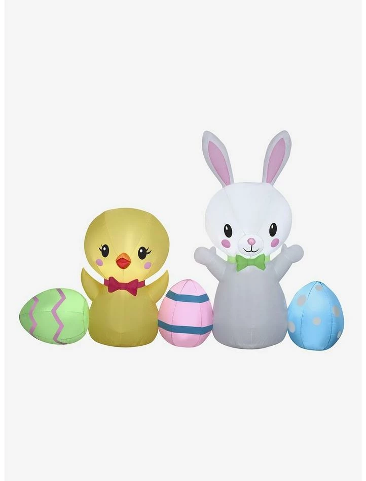 Celebrate the season with an Airblown Inflatable featuring a bunny, chick and three colorful Easter eggs! This charming Easter inflatable makes an eye-catching addition to your decorations. Setup is super simple. Just plug it in, stake it down and watch the magic unfold. Includes everything needed for easy outdoor setup.