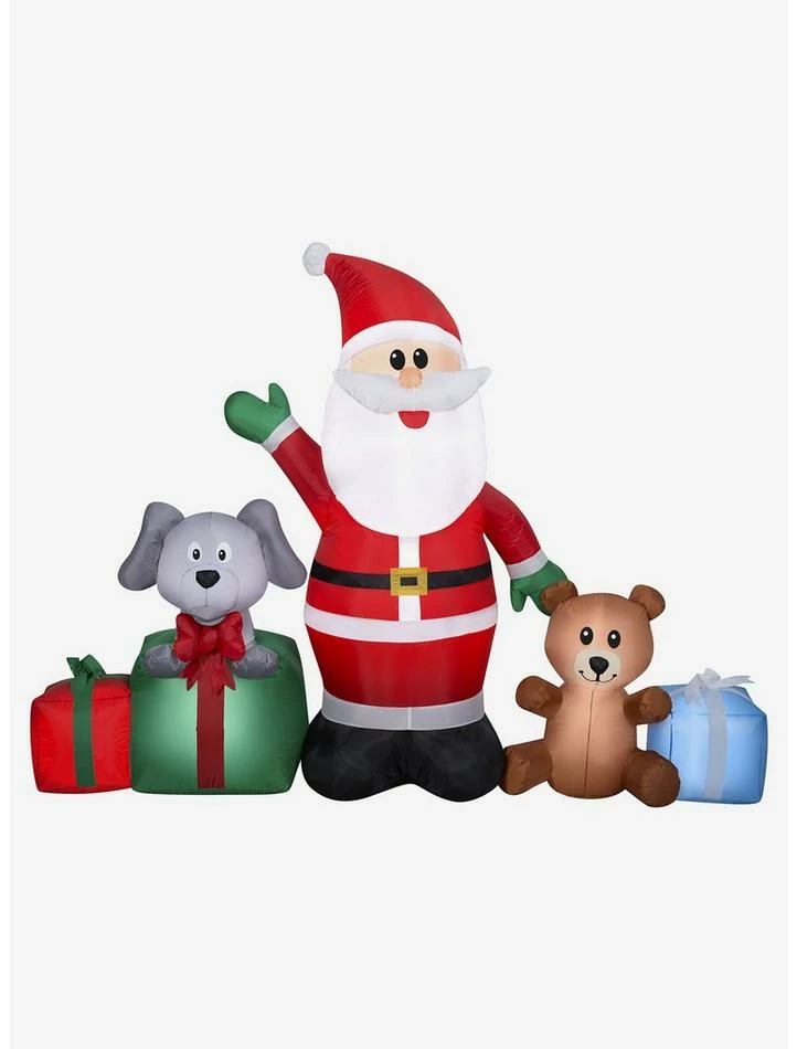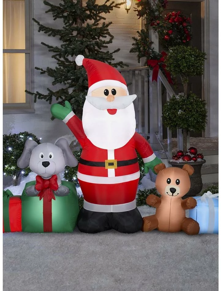 Deck the yard with an Airblown Inflatable Santa and gifts scene! Featuring Santa, a puppy, a teddy bear and three gift boxes, this charming outdoor inflatable makes an eye-catching addition to your Christmas decorations. Setup is super simple. Just plug it in, stake it down and watch the magic unfold. Display this Santa holiday decoration as a standalone or combine it with other Airblown Inflatables to create a custom scene. Includes everything needed for easy outdoor setup.