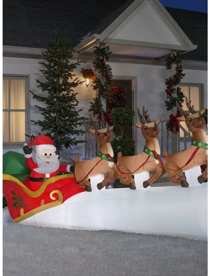 Ho, ho, ho, and away we go! Deck the yard with an Airblown Inflatable flying sleigh! Featuring Santa in his sleigh pulled by three reindeer, this outdoor inflatable makes an eye-catching addition to your Christmas decorations. Setup is super simple. Just plug it in, stake it down and watch the magic unfold. Display this classic holiday decoration as a standalone or combine it with other Airblown Inflatables to create a custom scene. Includes everything needed for easy outdoor setup.