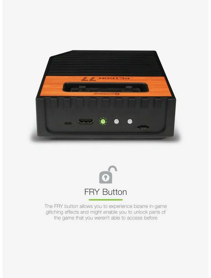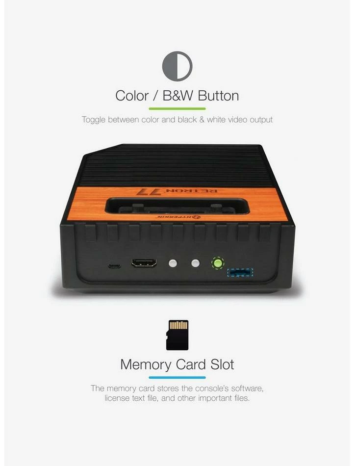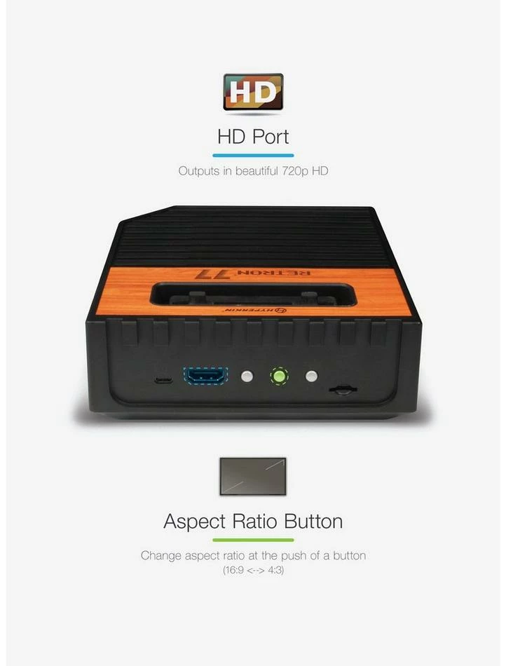 Leave your platform shoes at the door and spend the night in with the RetroN 77, the grooviest retro console from Hyperkin. It plays your favorite 2600 cartridges in beautiful, crisp 720p HD. It’s one happenin’ pixel party for the senses. Marvel at the slick wood paneling, save states, on-board mode select, and a 6 ft. Micro cable to power it all. You take full command with the included two-button, ambidextrous, premium controller. Original joysticks and paddles are also compatible. Can. You. Dig. It? Features: 3 ft HD cable One premium controller with 10 ft cable Two additional controller ports Upscales to 720p HD with 4:3/16:9 with aspect ratio button Supports 2600 cartridges and original joysticks and paddles Mode select, color change (color or black/white), and save status Memory card slot
