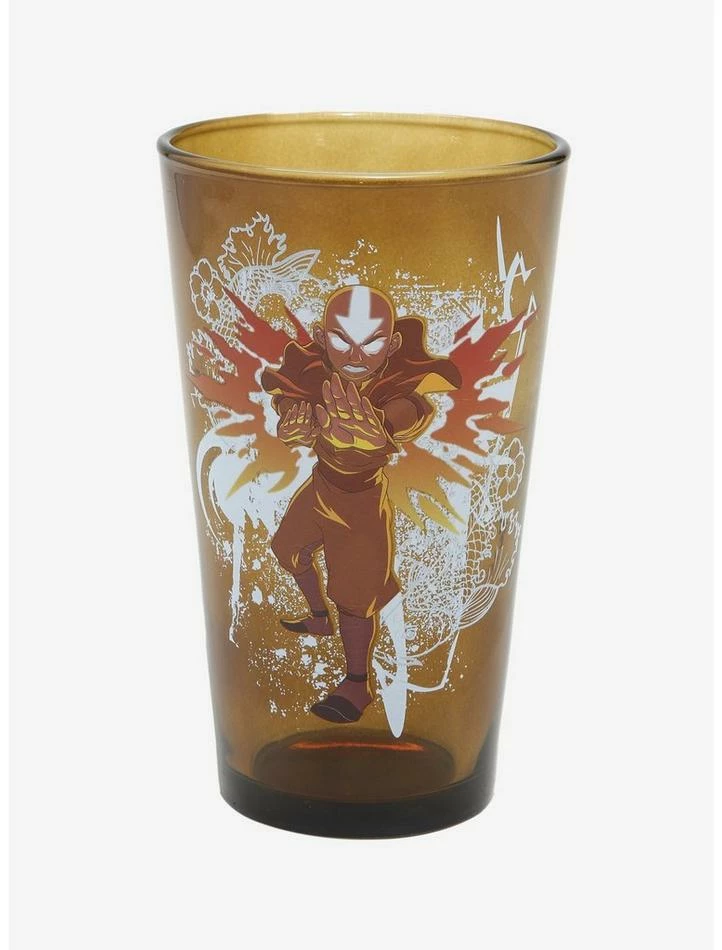 Done trying to master the four elements for today? Take a break with a nice cool glass of your favorite drink! This pint glass from Avatar: The Last AirbenderΒ features Aang in his Avatar state, with a paint splatter design behind him.