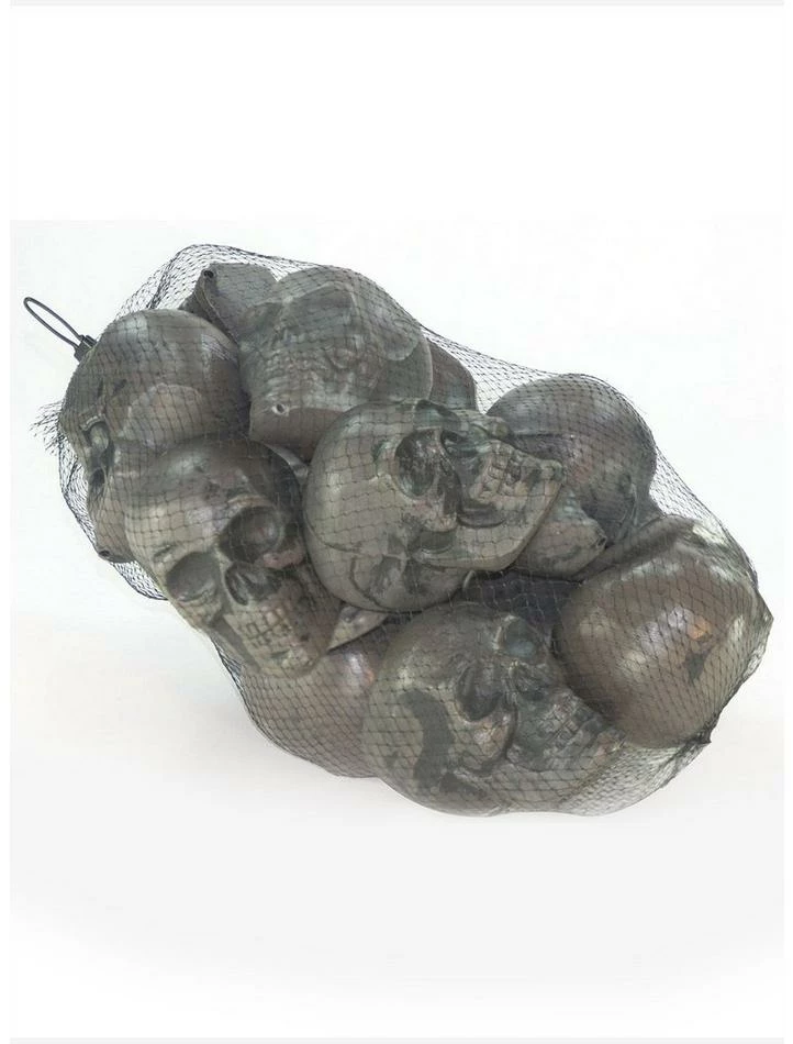 Replicas of human skulls make great Halloween decor. Stage a torture chamber. Place them throughout a graveyard scene. 12 plastic skulls are included. They arrive in a net bag.