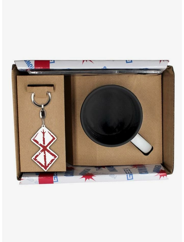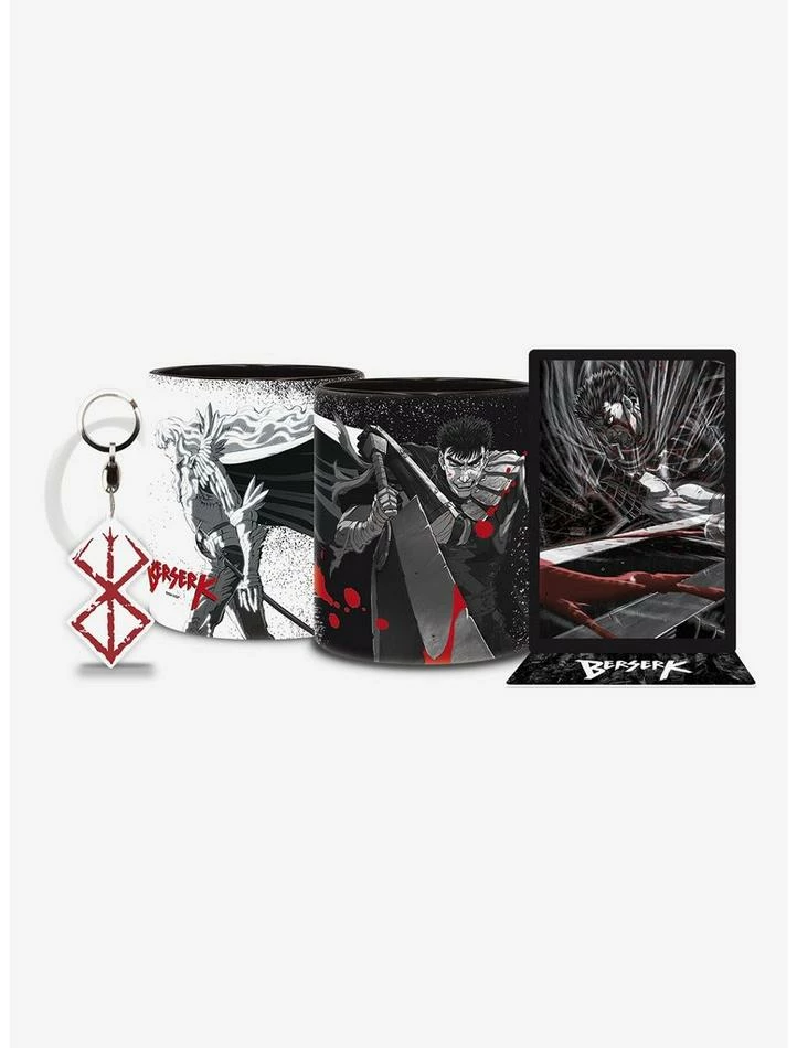 Officially licensed Berserk merchandise. Includes (1) Mug 11 oz, (1) Acryl figure, and (1) keychain. Mug features Guts and Griffith. Mug is dishwasher and microwave safe. Acryl figure features Guts. Keychain features a sturdy metal ring to ensure it stays securely attached to your keys, bag, or backpack.