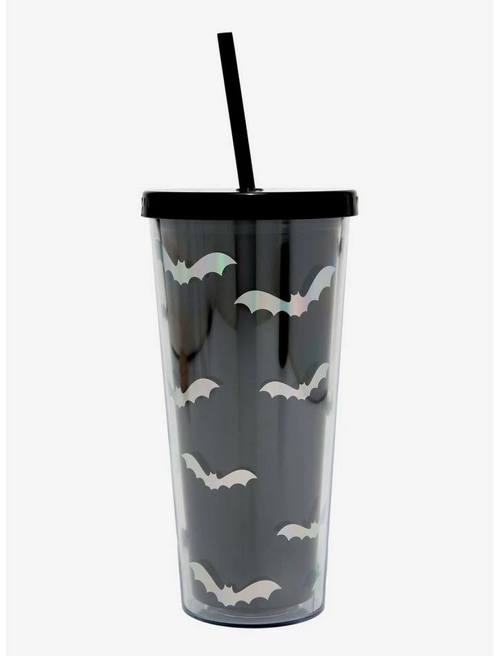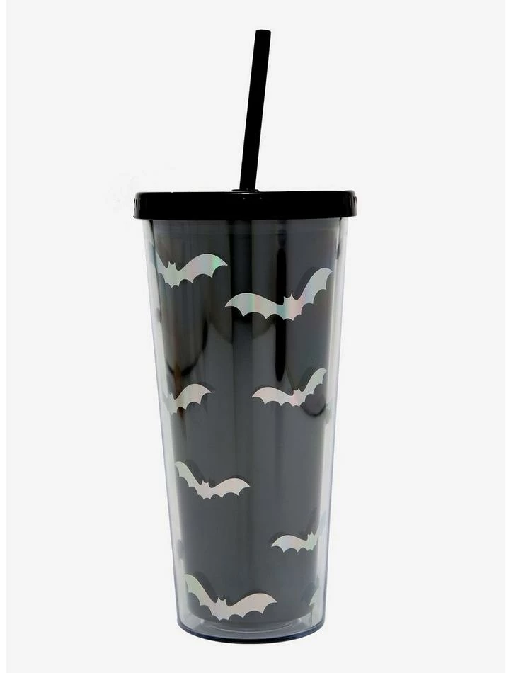 Stay hydrated while staying creepy with this black acrylic travel cup featuring a foil bat design.Β Includes screw-on lid and reusable straw.