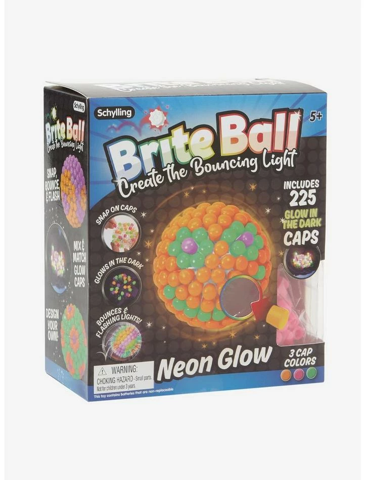 Brite Ball Glow is the bouncy ball that lights up your very own creations! Design it, watch it glow, and then bounce it for a light show. Comes with 225 glow-in-the-dark caps in neon orange, pink and green!