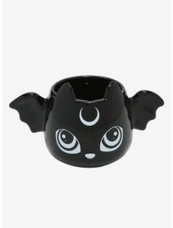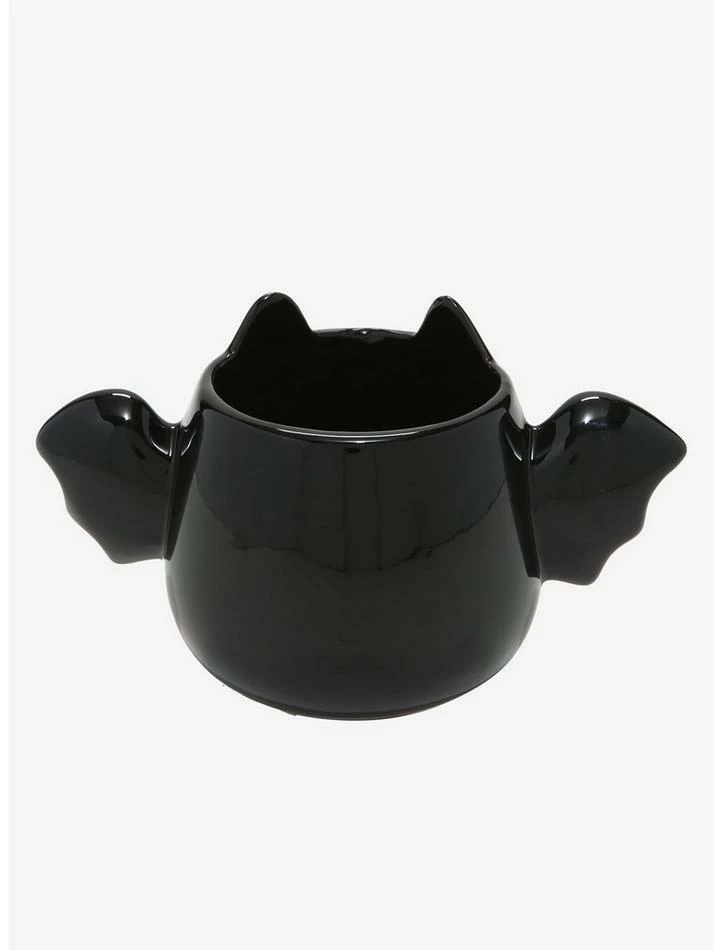 Drink up witches! Start your mornings off with a fresh cup of witch’s brew in this creepy cute figural mug, featuring a cat with bat wings.