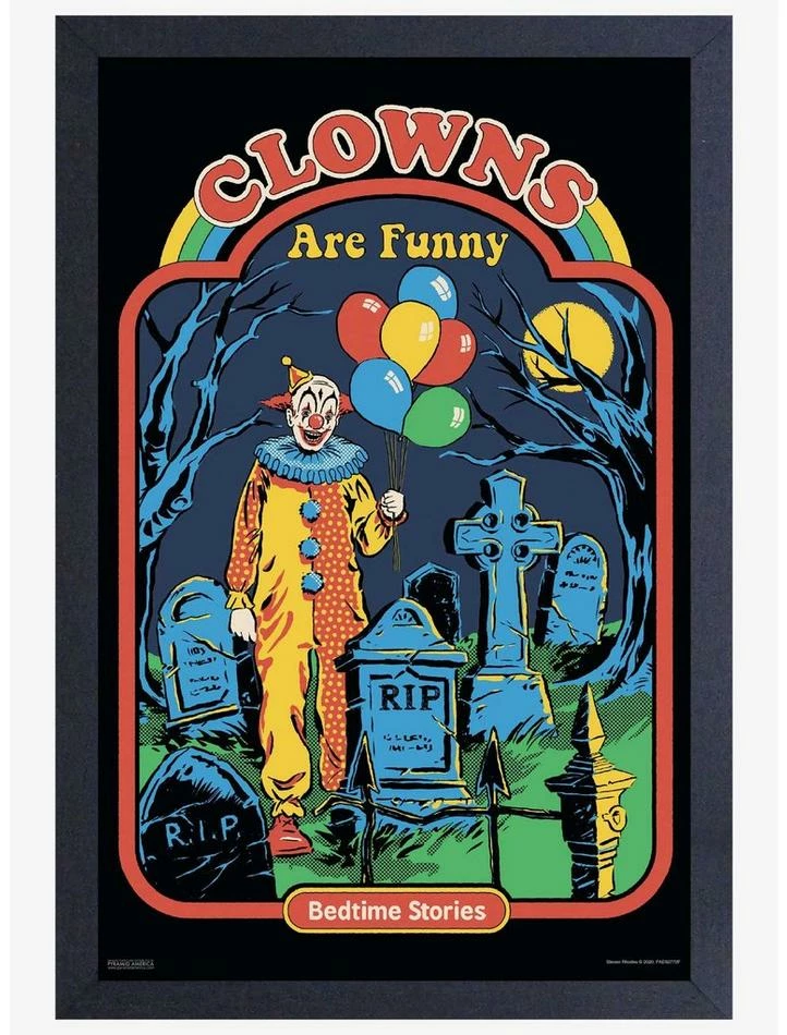 Bring good wall art to any room in the house with this high quality framed Clowns Are Funny poster print! Premium 11″ x 17″ print is framed to 13″ x 19″ and coated with a protective clear gel, which not only makes it super durable – it gives it that “movie screen” texture, too. Instantly hang your new work of art and enjoy Steven Rhodes’ creepy creation on your wall for years to come!