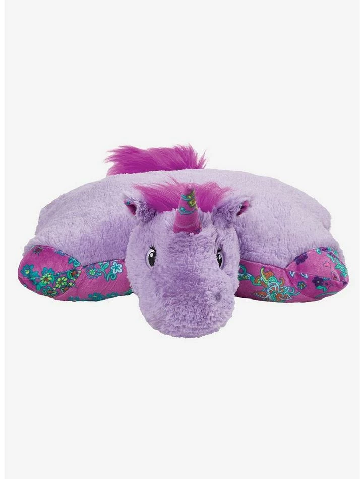 Featuring lavender-colored plush, hair, and lovely flower-patterned fabric on the bottom, the Pillow Pets Lavender Unicorn is the most enchanting stuffed animal pillow you can find! This super-soft chenille plush folding stuffed animal is so cuddly you’ll never want to put it down! The Lavender Unicorn Pillow Pet is an ideal nap-time companion not to mention a perfect accessory for any road trip or airplane ride. Pillow Pets are anything but just another pillow. Starts out as your pal, then unfasten its belly and quickly becomes a comfortable pillow! Made of high-quality washable chenille.