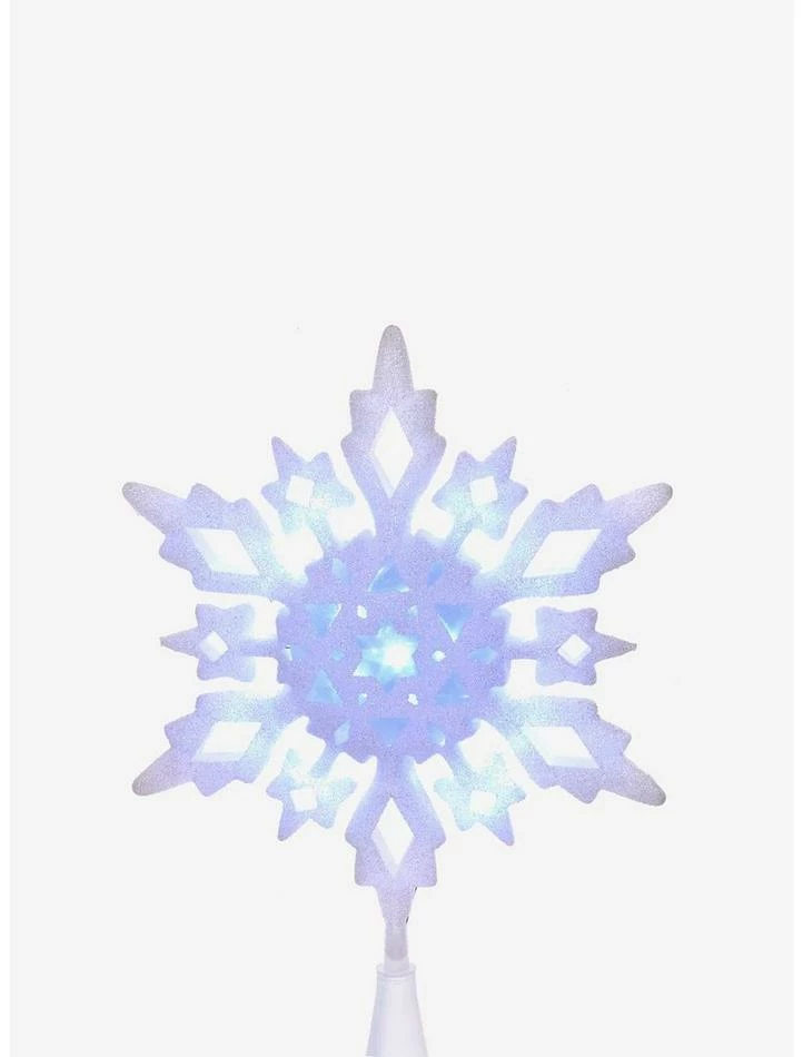 The 10-inch cool white LED glitter snowflake treetop from Kurt Adler is a beautiful addition your Christmas decor. The treetop is a white glittery snowflake which beams in fade in, fade out cool white lights.