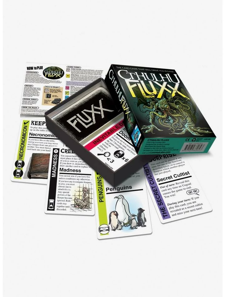 Follow the wild-eyed Poet, the obsessed Artist, and the expeditions of the Professor, as they investigate Eldritch Secrets no mortal was meant to discover. Someone has stolen the Necronomicon from the library at Miskatonic University, and a Farm in the hills is undergoing a horrifying Metamorphosis. Meanwhile, unspeakable abominations stir in Penguin-riddled Tombs beneath the ice. Are you Inevitably Doomed to a lifetime of Nightmares in the Sanitarium, or are you, in fact, a Secret Cultist, worshiping the Minions of Darkness? Gaze upon the ever- changing face of Madness with Cthulhu Fluxx!
