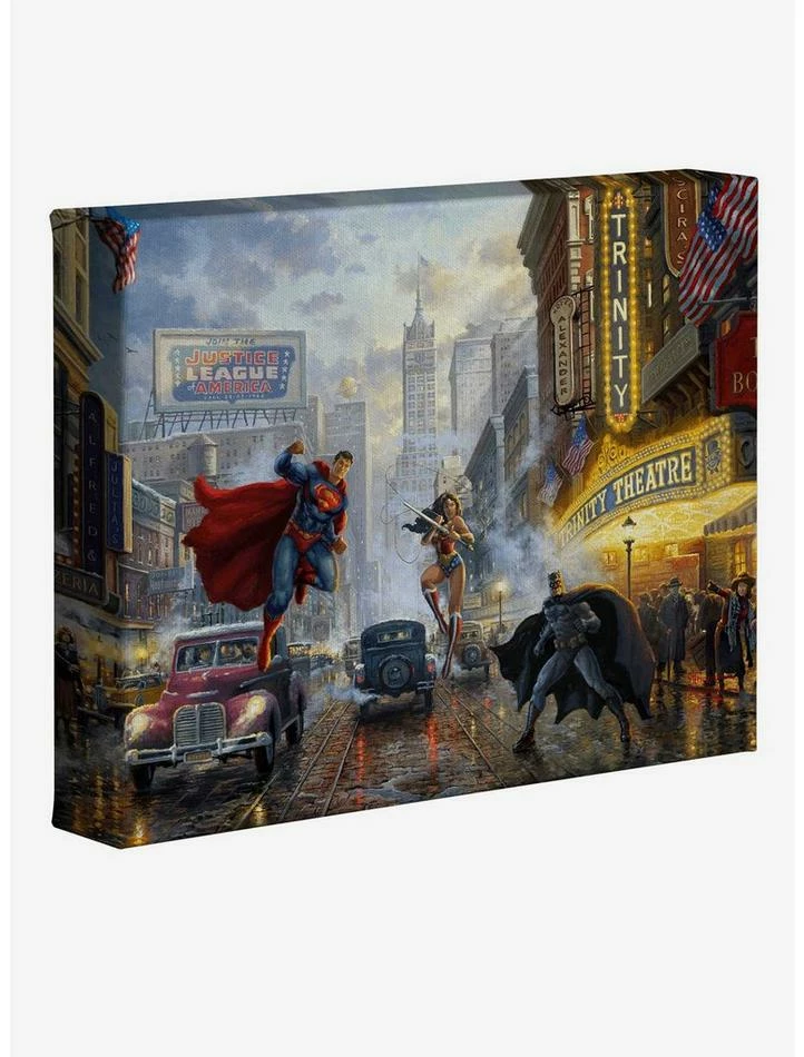 In this scene, the trio is preparing to fight an enemy in a place that evokes iconic memories from each hero?s personal history. From arch enemies and beloved friends to important dates, we invite you to explore the hidden salutes we have included in this painting. Thomas Kinkade Studios Gallery Wraps are perfect for any space. Each wrap is crafted with our premium canvas reproduction techniques and hand wrapped around a deep, hardwood stretcher bar. Hung as an ensemble or by itself, this frameless presentation gives you a versatile way to display art in your home. Certificate of authenticity included.ย