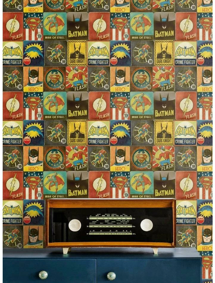 Classic comic book colors and designs in retro style recognize the heritage of superheroes in this Vintage Justice League peel and stick wallpaper design. Batman, Superman and the Flash are all represented in Golden Comic Age styles making this wallpaper a must have for any true comic book fan. Peel and stick wallpapers are an easy and affordable way to decorate. Peel off the paper backing and smooth onto the wall, no additional adhesive required. When it?s time to redecorate, simply remove them effortlessly in full strips with no remaining sticky residue or damage to walls.Β