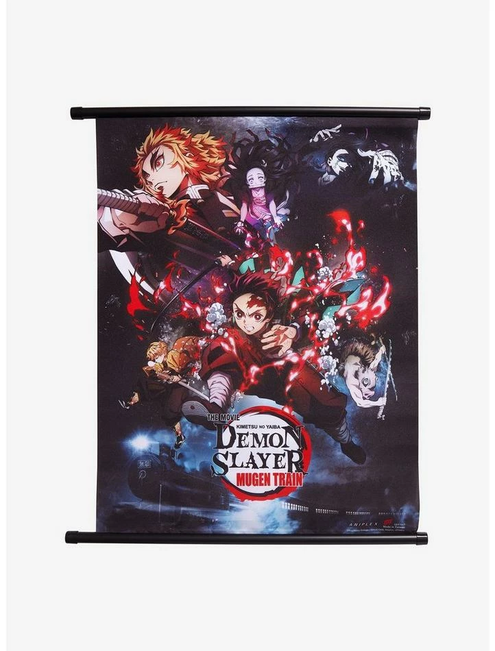 Still obsessed with the Demon Slayer: Kimetsu no Yaibaย movie? Rep the Mugen Train Arc with this wall scroll, featuring art from the film that has all of your faves like Rengoku, Nezuko, Enmu and the main trio! Comes ready to hang with plastic sheaths and plastic hooks.