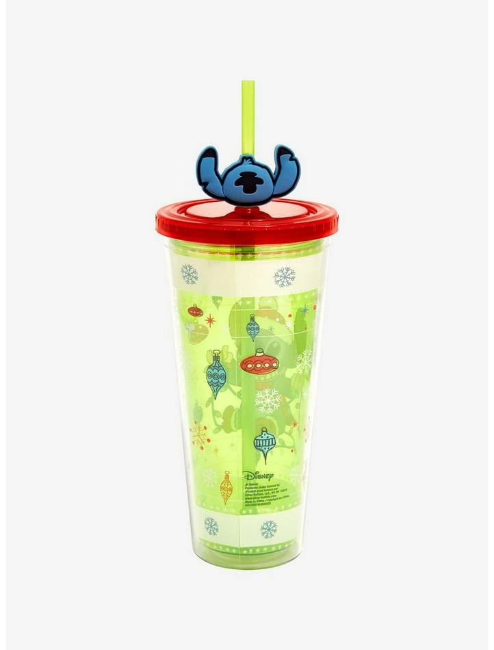 Stay festive and hydrated with this acrylic travel cup featuring an image of Stitch with holiday lights on a holiday sweater background. Includes screw-on lid, reusable straw and Stitch charm.