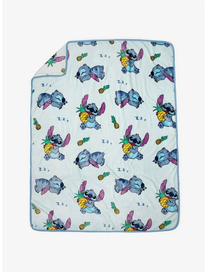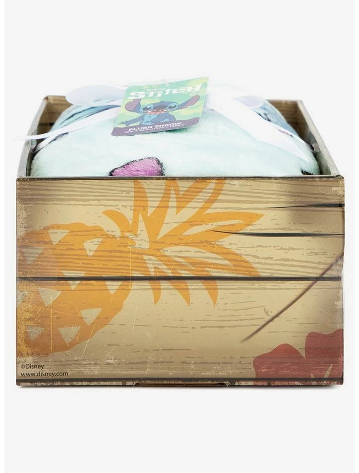 Stitch has two modes: eating pineapples and snoozing. We can relate! This throw blanket features a toss print of Stitch holding pineapples, Stitch snoozing, plus pineapples and Zs. Time for a nap. It also comes in a faux pineapple farm box.