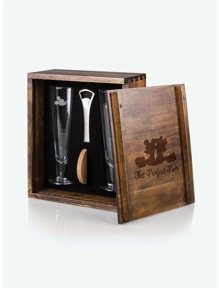 Oh boy, time for beverages! The handsome acacia wood and dovetail joinery of the Mickey Mouse and Minnie Mouse Beverage Glass Set for two can stand alone on your tabletop or bar cart as an objet d’art. When you remove the sliding lid, you’ll see two tall 12 oz. fluted glasses, two real cork beverage coasters, and a deluxe bottle opener. Fancy!