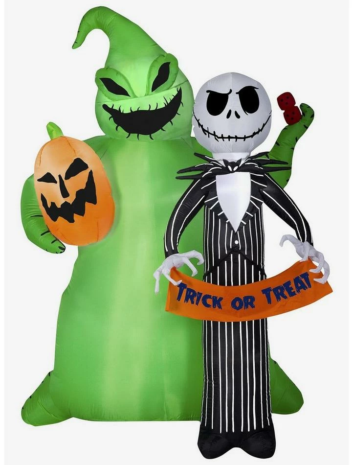 Get ready for Halloween with this The Nightmare Before Christmas Jack & Boogie 6.5 Ft. Airblown Inflatable. It powers on using an AC plug and fully inflates with a built-in fan. Jack Skellington is holding a trick-or-treat sign. Oogie Boogie is next to him with a pumpkin in one hand and dice in the other. There are interior LED lights adding a glow to the display. Add this decoration to your lawn scene or home entrance to greet visitors.