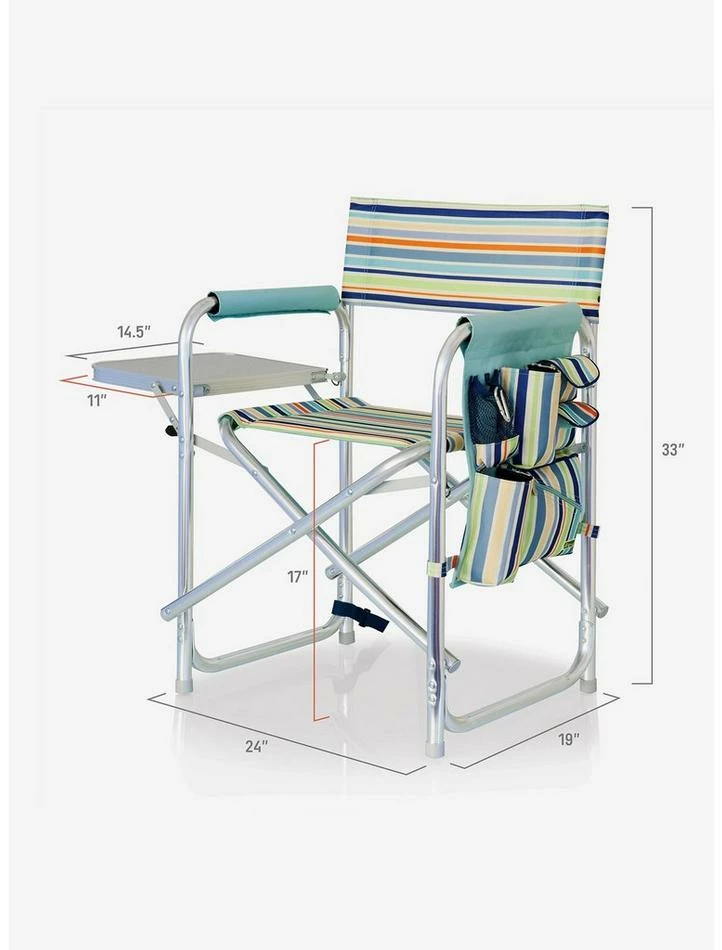 With classic lines and modern touches, this smart travel chair is made of durable polyester canvas on a foldable and lightweight aluminum frame. Features a padded seat and armrests, a fold-out side table, a hanging arm rest caddy, two insulated beverage pockets, and a variety of additional pockets. Grab-and-go with the underseat carrying handles or use the adjustable, detachable shoulder strap for longer treks. Ideal for camping, picnicking, concerts in the park, or watching your favorite sport comfortably from the sidelines.