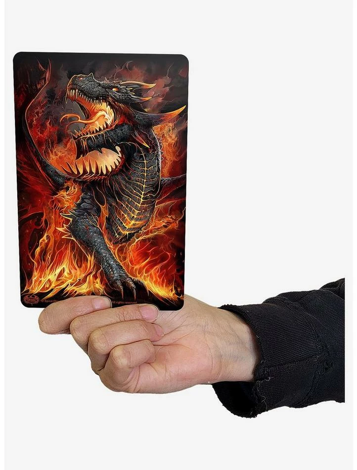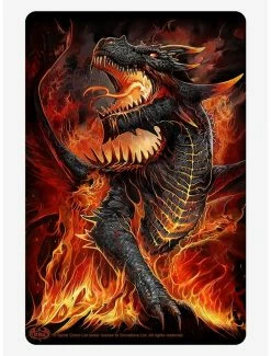 Wings of charred sulphur envelope the suffocating heat burning from within this dragon?s belly. Molten lava seeps from every crack along her body, dripping to the ground where furious flames whip and lick at her feet.