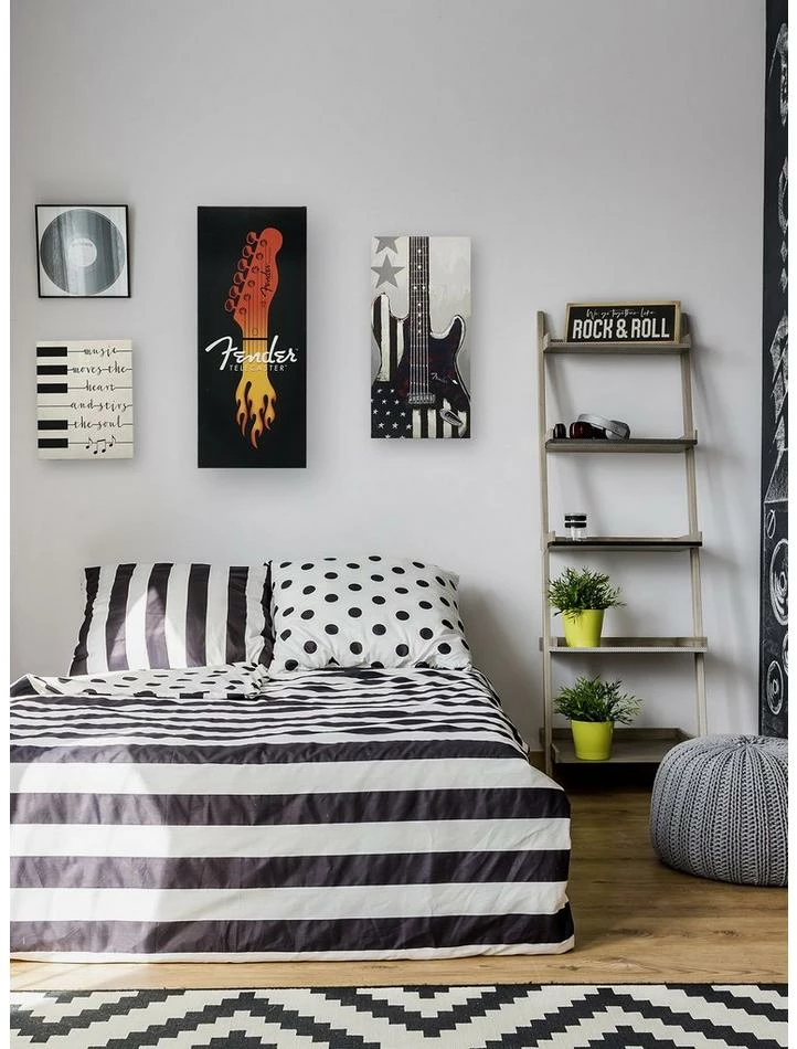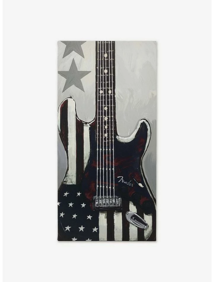 Jam out with this fun wall decor! Featuring a black and white Fender guitar with stars and stripes, this piece is a charming, patriotic way to personalize your space.