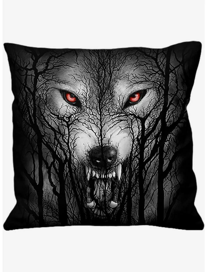 A menacing shape emerges in the nocturnal landscape – a snarling, howling wolf within the trees, with blood-red eyes and gleaming teeth. The spirit of the hunt is alive and hungry. Woven cotton cover with polyester filling.ย