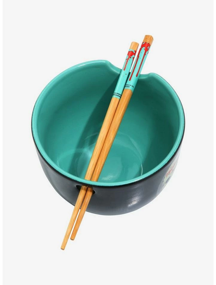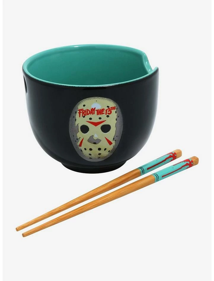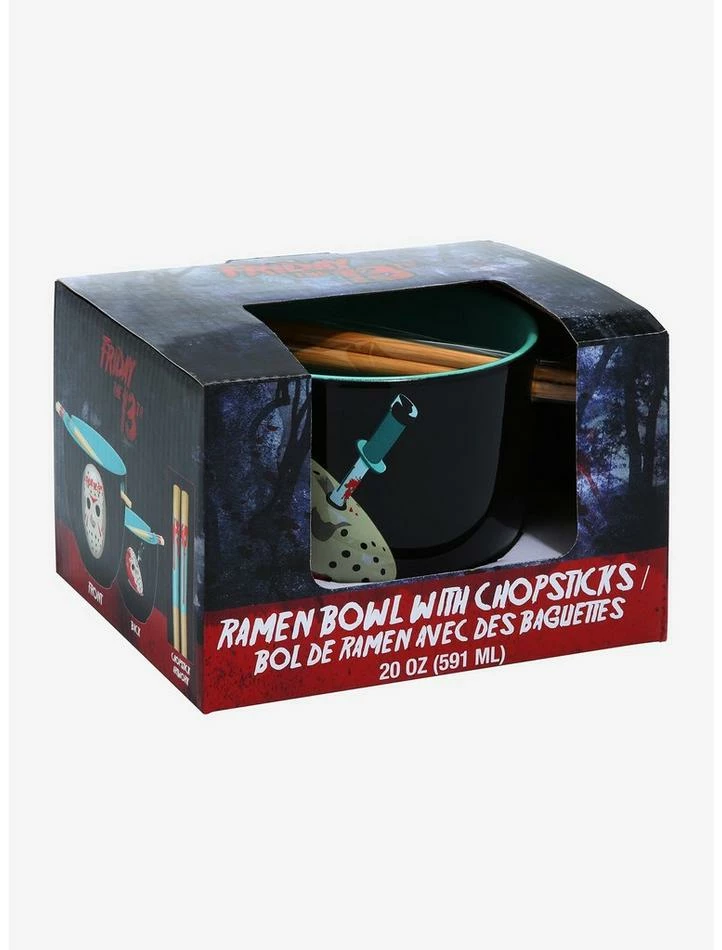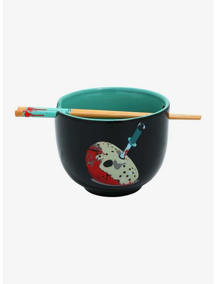 This killer ramen bowl will definitely have you screaming “TGIF”! Binge your favorite slasher movie while enjoying a warm bowl of noodles. This bowl features a print of Jason’s signature hockey mask with blood splatter all over, and the Friday the 13thย movie title on the back. Comes with chopsticks, as well as a notch and hole to set them on.
