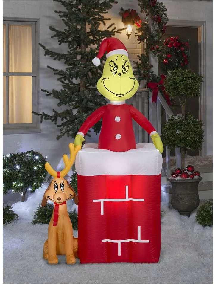 Fans of How the Grinch Stole Christmas will love this animated Airblown Inflatable Grinch and his trusty pal Max! Wearing a Santa suit, the Grinch rises from the chimney for a Christmas surprise. This How the Grinch Stole Christmas inflatable makes an eye-catching addition to your holiday decorations. Setup is super simple for this outdoor inflatable. Just plug it in, stake it down and watch the magic unfold. Display this Grinch Christmas inflatable as a standalone or combine it with other Airblown characters to create a custom scene.