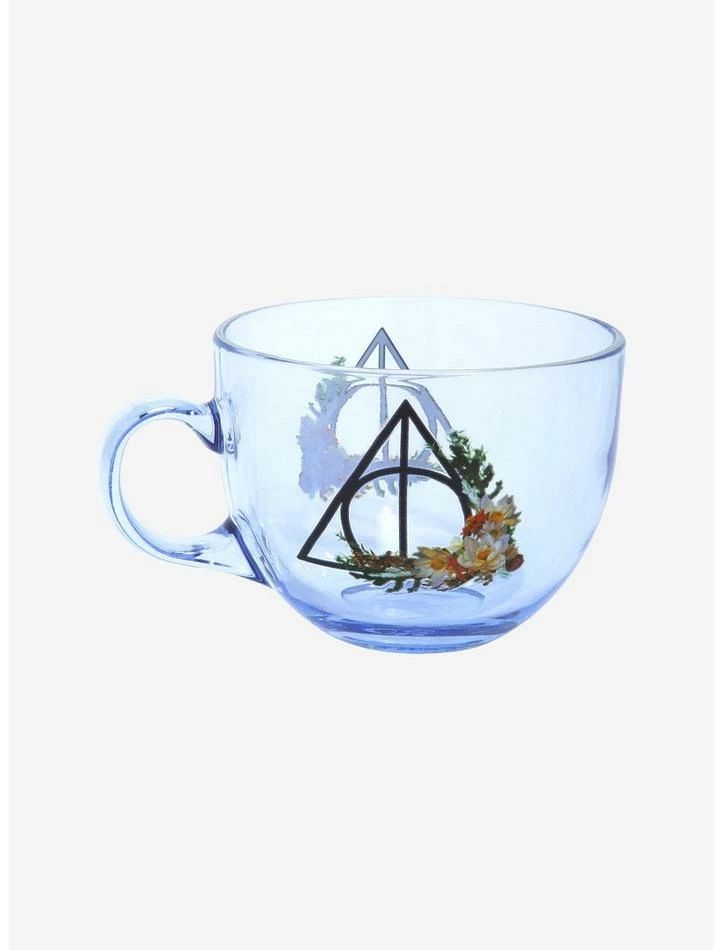 Brew yourself something hydrating before your next Hogwarts class! This Harry PotterΒ glass mug features the Deathly Hallows symbol on bot sides with floral detailing.