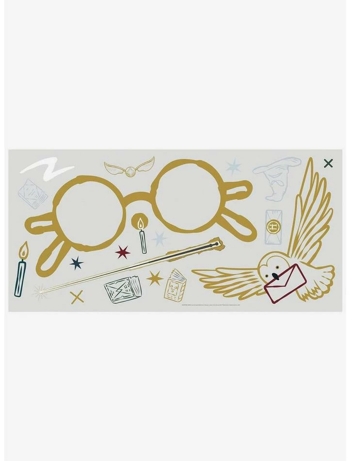 Decorate your walls with officially licensed Harry Potter magic with this Harry Potter Glasses peel and stick giant wall decal. All essential wizard items, from wand to hat and Hedwig the owl, are included in this oversize decal set, creating awesome wall dΓ©cor on any fans feature wall. Wall decals are an easy and affordable way to decorate in minutes. Reposition or remove them effortlessly with no remaining sticky residue or damage to walls.Β