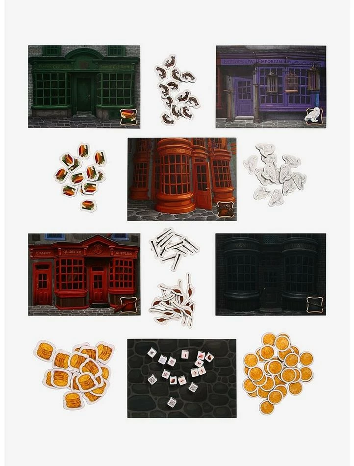 Manage the magical mayhem in this fast-paced, simultaneous play dice game inspired by the wizarding world of Harry Potter! First-year Hogwarts students are rushing to Diagon Alley with their shopping lists, but the magical items have been hexed and are found mixed up among all the shoppes! Quickly roll the dice to fling the scattered brooms, books, and other supplies back to where they belong to be the first one with an organized shoppe to win!ย