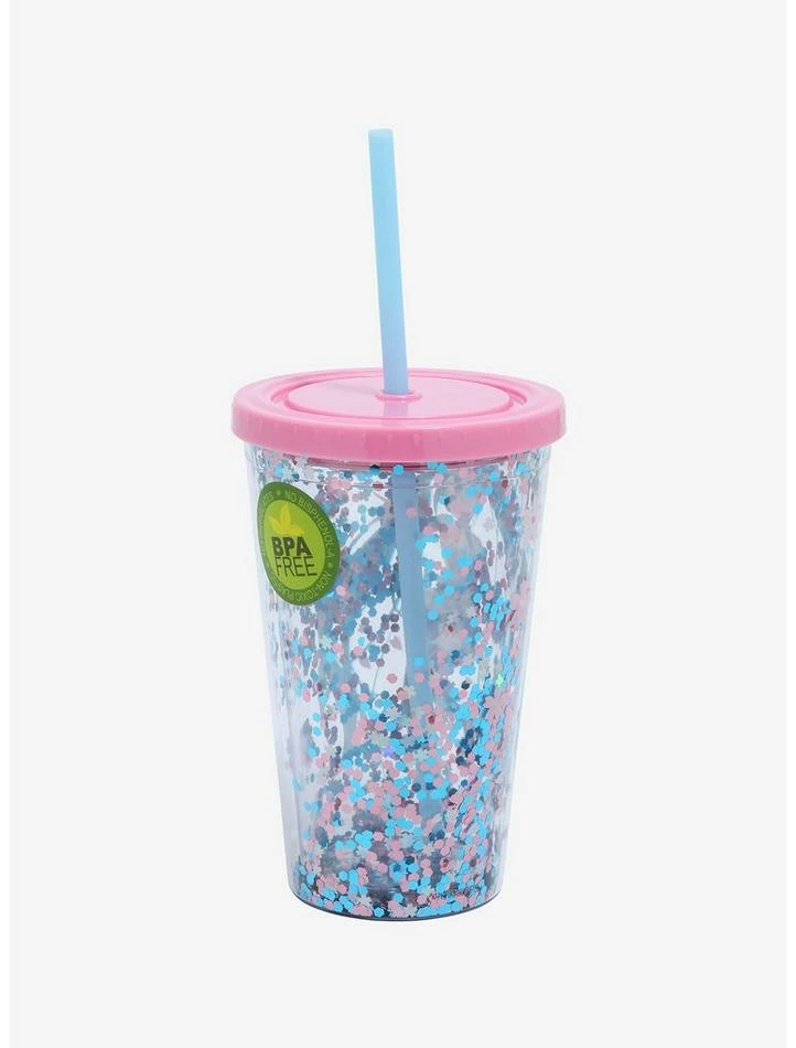 Hydrate before the next virtual singer concert with this acrylic travel cup, featuring Hatsune Miku with sakura blossoms plus blue & pink glitter. Screw-on lid and reusable straw.