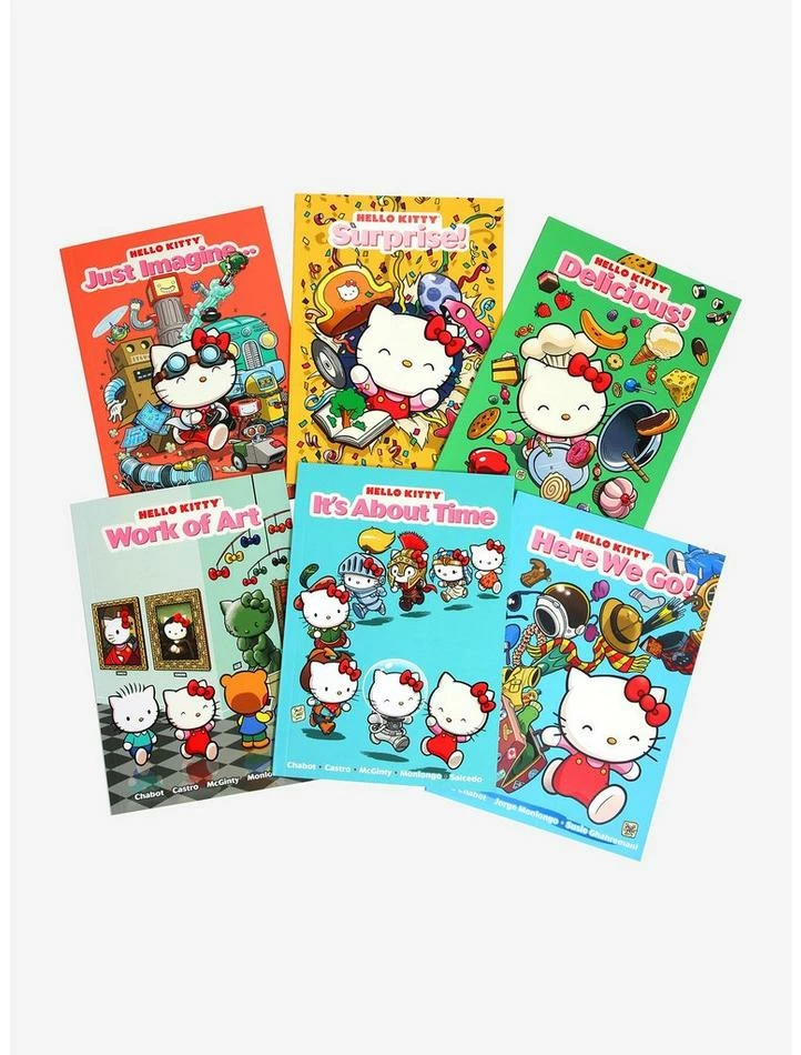 Join Hello Kitty in her first-ever comic book adventures as she explores other worlds, delights in delicious food and treats, discovers secrets, solves mysteries, invents amazing machines, makes music, produces plays, dreams up rainy day adventures, and so much more!ย This 6-volume box set of fun and friendship includes graphic novels about food, travel, surprises, imagination, art and time.