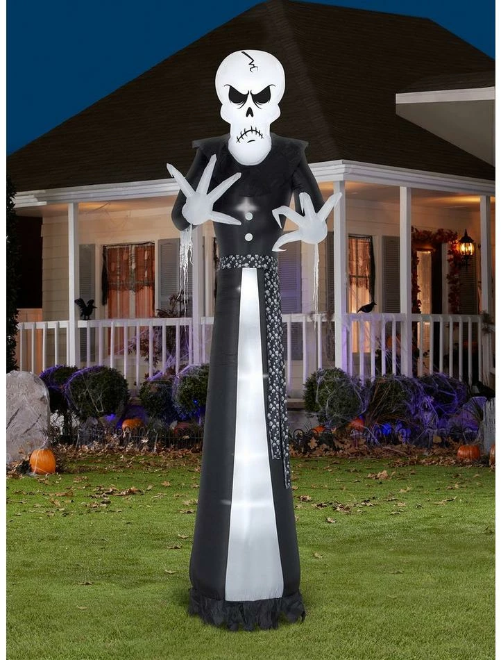 Kick up the fright factor with a giant Airblown Inflatable ghoul! Standing 12-feet tall, this dapper ghoul is styled with a creepy skull head and flowing robe. Accented with an ornately patterned belt at the waist, it makes an eye-popping addition to your Halloween decorations. Setup is super simple. Just plug it in, stake it down and watch the magic unfold. Display this Halloween inflatable as a standalone or combine it with other Airblown Inflatables to create a custom scene. Perfect for Halloween parties and haunted houses.