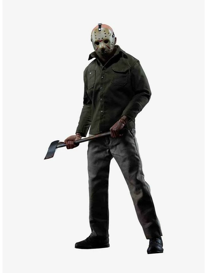The sixth scale figure features a unique body with a fully sculpted torso and arms, a detailed multi-piece hockey mask portrait, axe and machete with blood details, expertly tailored costume, and two sets of interchangeable hands.