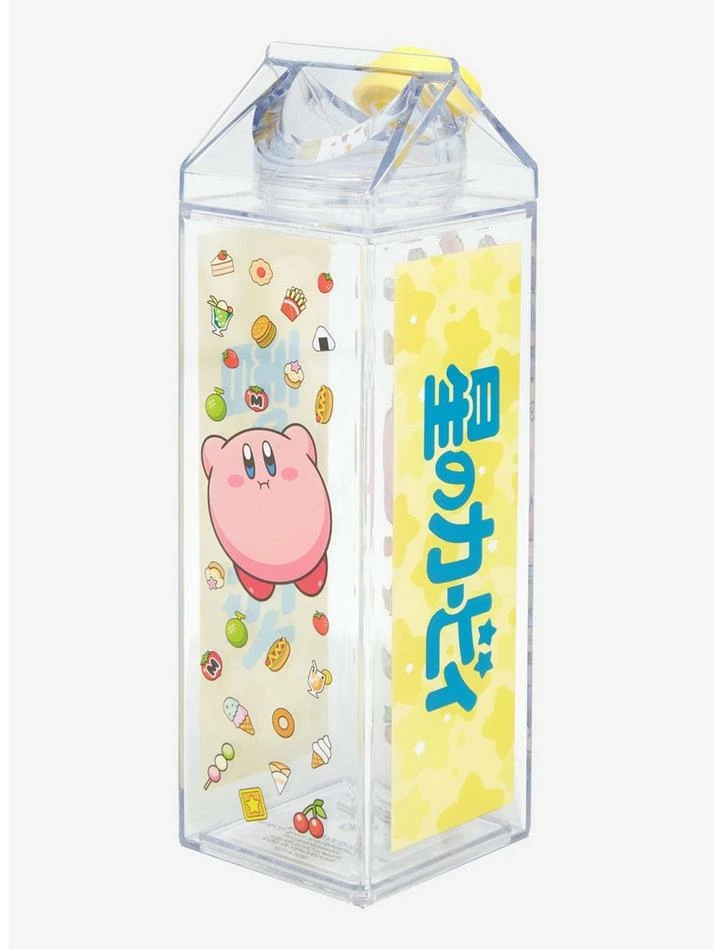 Wash down all those heroic eats with something refreshing! This milk carton-shaped water bottle features Kirby surrounded by all his favorite snacks. Comes with a screw-on lid.