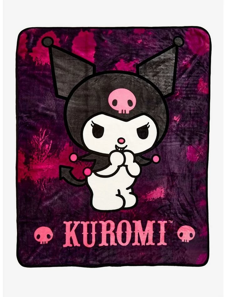 Keep it devilish and cuddly with this Kuromi blanket! Your fave Sanrio character is featured with her name below, snickering in front of a dark wash background.