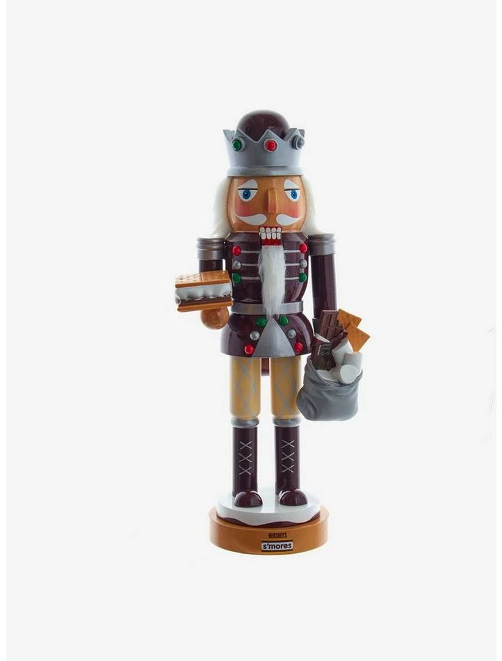 This Kurt Adler 14-inch Hershey’s S’mores Nutcracker is a fun, festive way to add to any holiday decor or nutcracker collection. Perfect for those with a sweet tooth, this classic nutcracker stands at attention with red, silver and red accents on his coat. In one hand is a S’more and in the other is a silver sack filled with Hershey’s chocolates, marshmallows and graham crackers. Topped off with a silver and brown Hershey’s crown, this nutcracker is the prefect touch of whimsy to any decor.