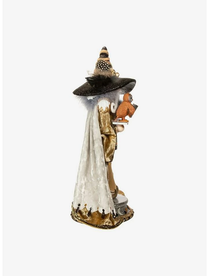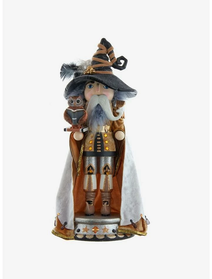 Hollywood Nutcrackers is a whimsical collection of nutcrackers created exclusively for Kurt S. Adler, Inc. and features an assortment of designs that put a unique, vibrant, memorable twist on traditional nutcrackers. Kurt S. Adler’s 17-inch Hollywood Wizard Nutcracker features a brown, silver and gold glittered color scheme with matching wizards hat. This wizard is holding an owl atop a spell book and is standing on a silver and black glittered base with amber gemstone accents.
