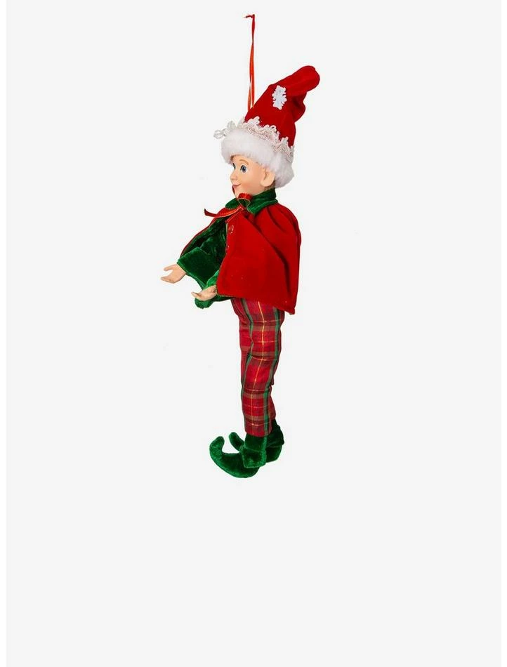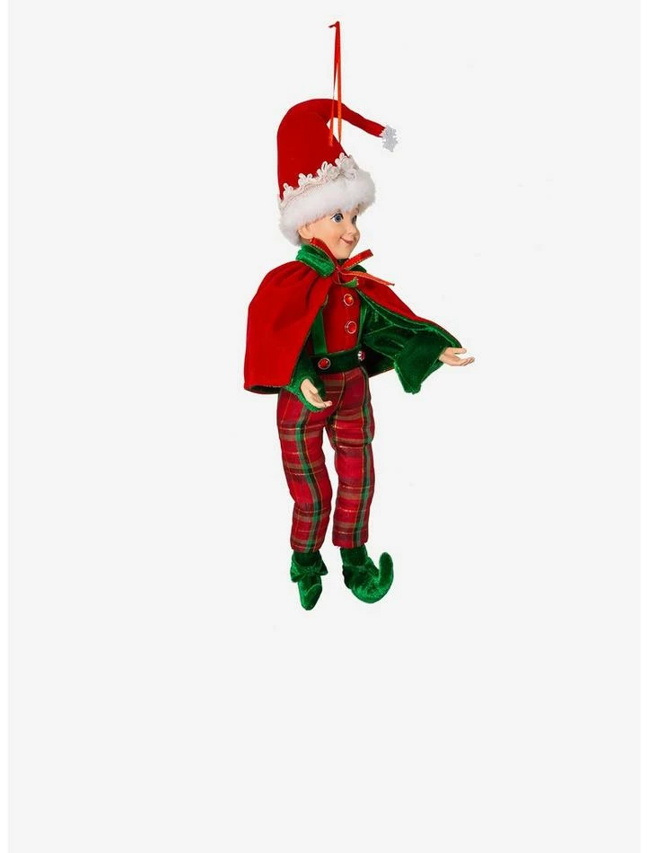 This 15-inch Kringle Klaus Elf Plaid Pants Ornament from Kurt Adler is a traditional addition to any holiday home decor. This 15 inch ornament features a happy elf dressed in a robe of red and green along with green shoes and a red and white hat. Part of the Kringle Klaus collection.