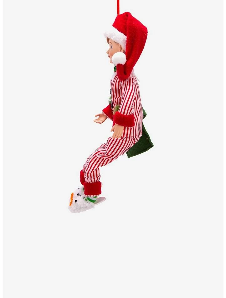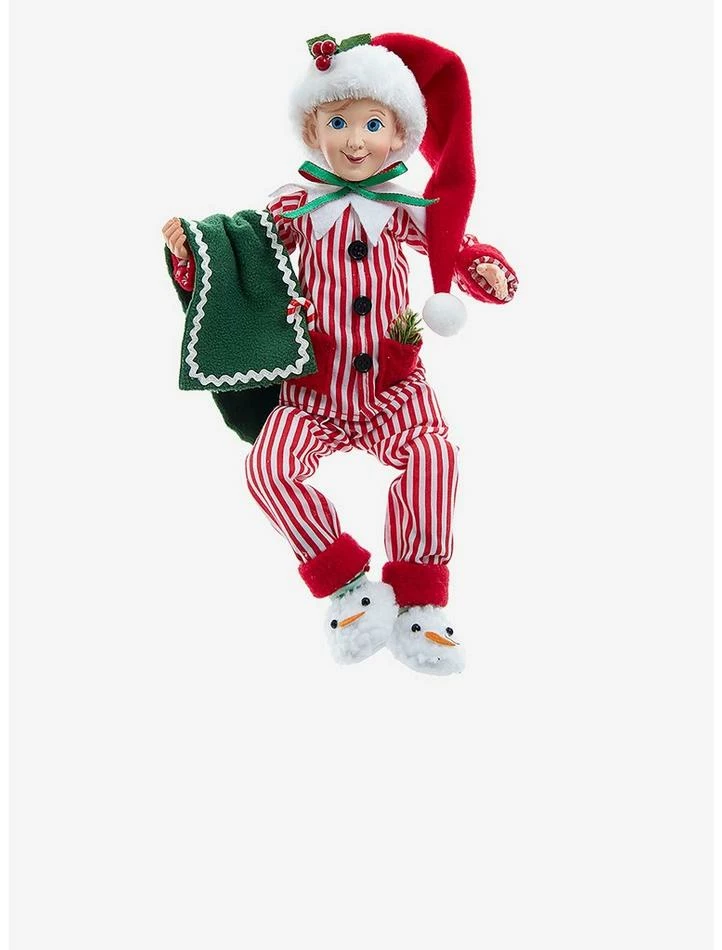 This 15-inch Kringle Klaus Elf with Pajamas Ornament from Kurt Adler is a traditional addition to any holiday home decor. This 15 inch ornament features a happy elf, dressed in red and white pajamas with a festive hat, smiling slippers, and a green blanket in his hand. Part of the Kringle Klaus collection.