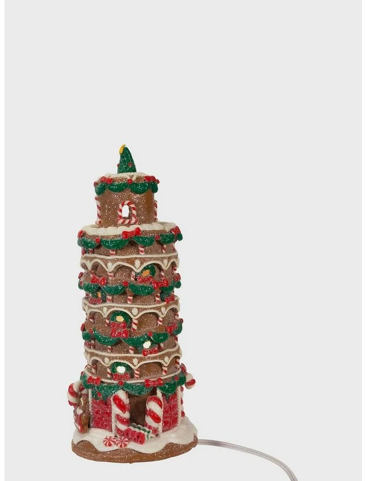 Kurt Adler’s 10-inch Leaning Tower of Pisa with C7 Bulb Gingerbread House is a fun, unique addition to your home or office holiday decor. It features a gingerbread couple standing in front of the iconic structure along with red and white candy canes, red and green garlands and a decorated Christmas tree on top. It is glittered throughout for a sugared effect and when switched on it is illuminated from within for a soft glow.