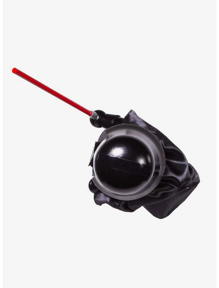 Darth Vader is featured here wearing his iconic all black helmet, armor, and cape, while holding a red light saber.