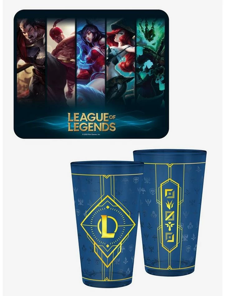 Officially licensed League of Legends products. Glass holds approximately 16 oz. Mouse pad features fan-favorite champions including Darius, Ahri, Miss Fortune, and more. Glass features the League of Legends logo and a Hextech aesthetic. Mouse pad measures 9.25″ L x 7.7″ H.