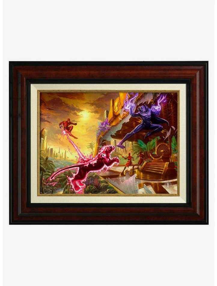 The nation of Wakanda is now protected by T’Challa, the new king in a long legacy of Black Panther warriors that protect their people. In the evening sky, Klaw hovers above Wakanda sonically empowering his insidiously lethal and ironic creation to attack our hero, Black Panther. The Dora Milaje, elite female warriors known as the adored ones, stand at the ready to protect the protector, T’Challa, from this new threat. Faced with treachery and danger and motivated by the memory of his father’s murder at the hands of this evil villain, Black Panther is ready to do battle with his archenemy and secure the safety of his people. Thomas Kinkade Studios proudly presents its new Marvel Comics collaboration: Black Panther.