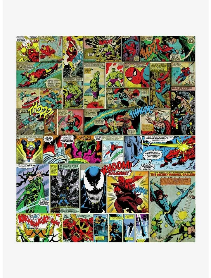 Marvel Comic characters are woven together in a comic panel collage-style on this officially licensed Marvel Comics wall tapestry . Spider-Man, Thor, Hulk, Ant-Man, Venom, Thanos, Iron Man, and Captain America are grandiosely featured in this 60? high by 52? wide wall hanging. Bold comic book colors of red, blue, yellow and green give a wide range of d?r opportunities to coordinate with. Tapestries are an effortless way to decorate in minutes.