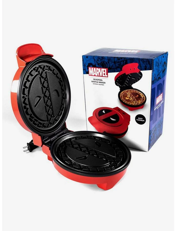 Deadpool enters in your kitchen with this striking, full-color waffle maker. Detailed, die-cast aluminum plates on the inside are easy to clean and make a perfect impression of Deadpool’s iconic logo every time. Pour in batter, eggs, brownies, shredded potatoes, or whatever strikes your fancy. Dual indicator lights tell you when it’s time to pour batter and when your waffles are cooked. Deadpool waffles are the perfect way to spread pop culture cheer to any Marvel fan’s kitchen. Officially licensed product.