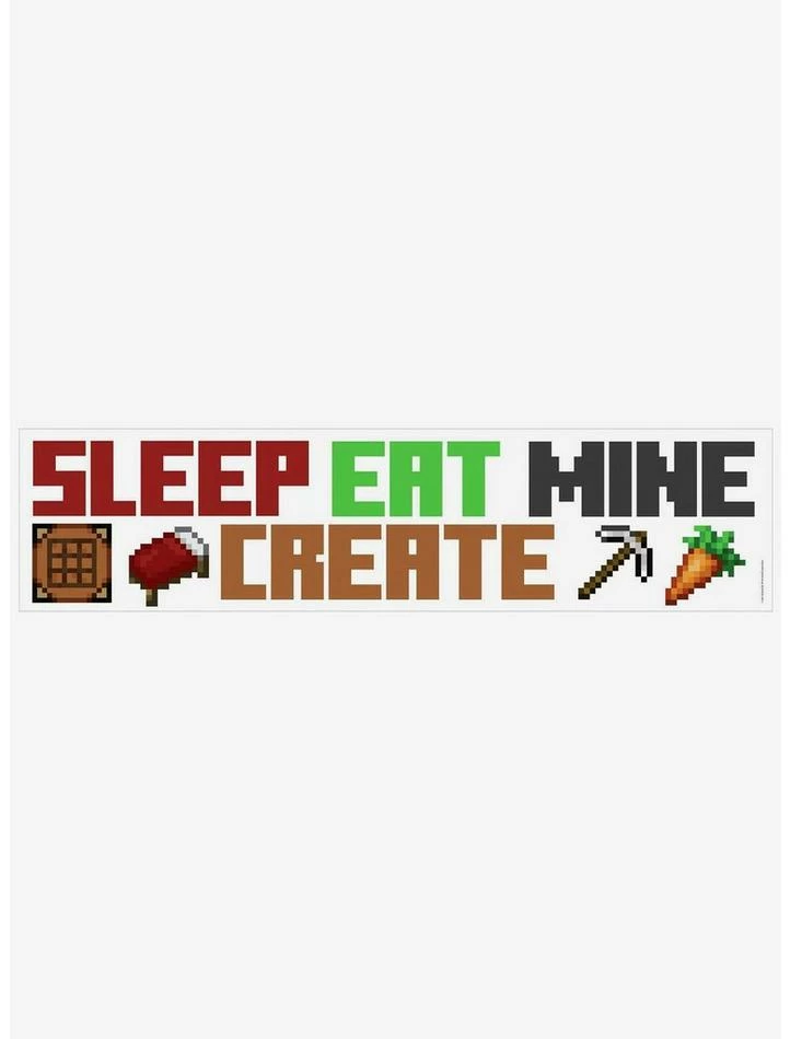 Inspire your next gaming session with these officially licensed Minecraft Eat Sleep Mine Create Peel and Stick Wall Decals. Bring the virtual world of block building to life in any room! Wall decals are removable and repositionable with no damage to the wall and no sticky residue.