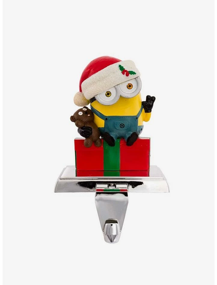 Hang your favorite stocking with this fun and adorable Minion Bob with Bear Stocking Holder from Kurt Adler. Bob is featured here in his blue overalls and a red and white Santa hat. He is holding a teddy bear and sitting on a large gift box.