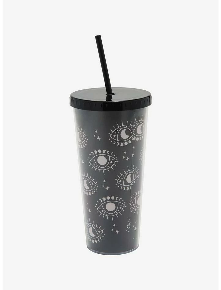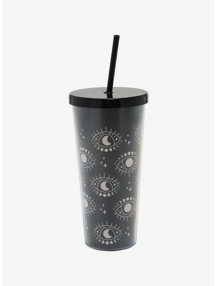 Ward off hydration with the help of this black acrylic travel up featuring a celestial eye design with black screw-on lid and straw.ย