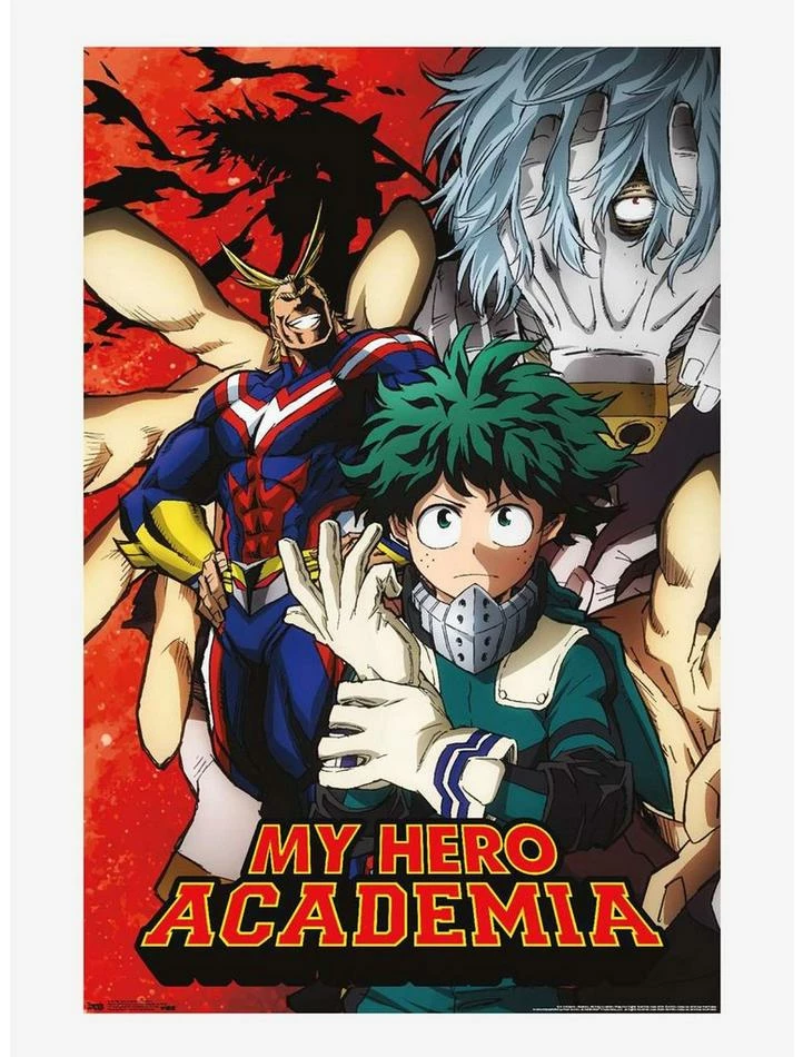 Take your room Plus Ultra with this poster from My Hero Academia featuring Deku front and center with All Might andΒ Tomura Shigaraki in the background.